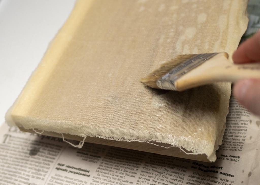 The process of preparing the board takes several days. First, the board is cut to size, the edges are sanded smooth, then 2 layers of natural hide glue are painted on. After that an open weave fabric is glued on. This fabric helps the gesso adhere better to the board, and also if the wood ever warps, it will help stop the paint from cracking.