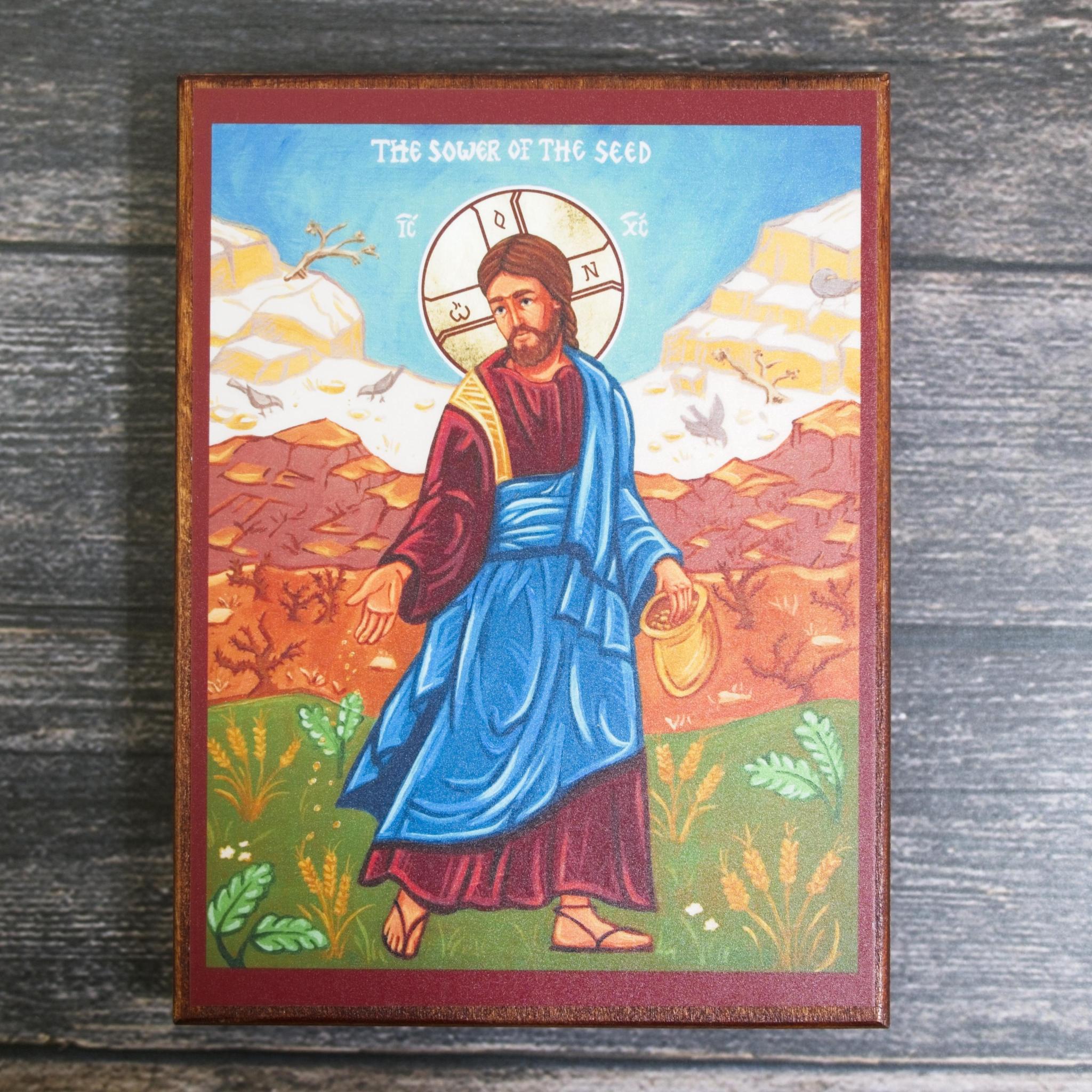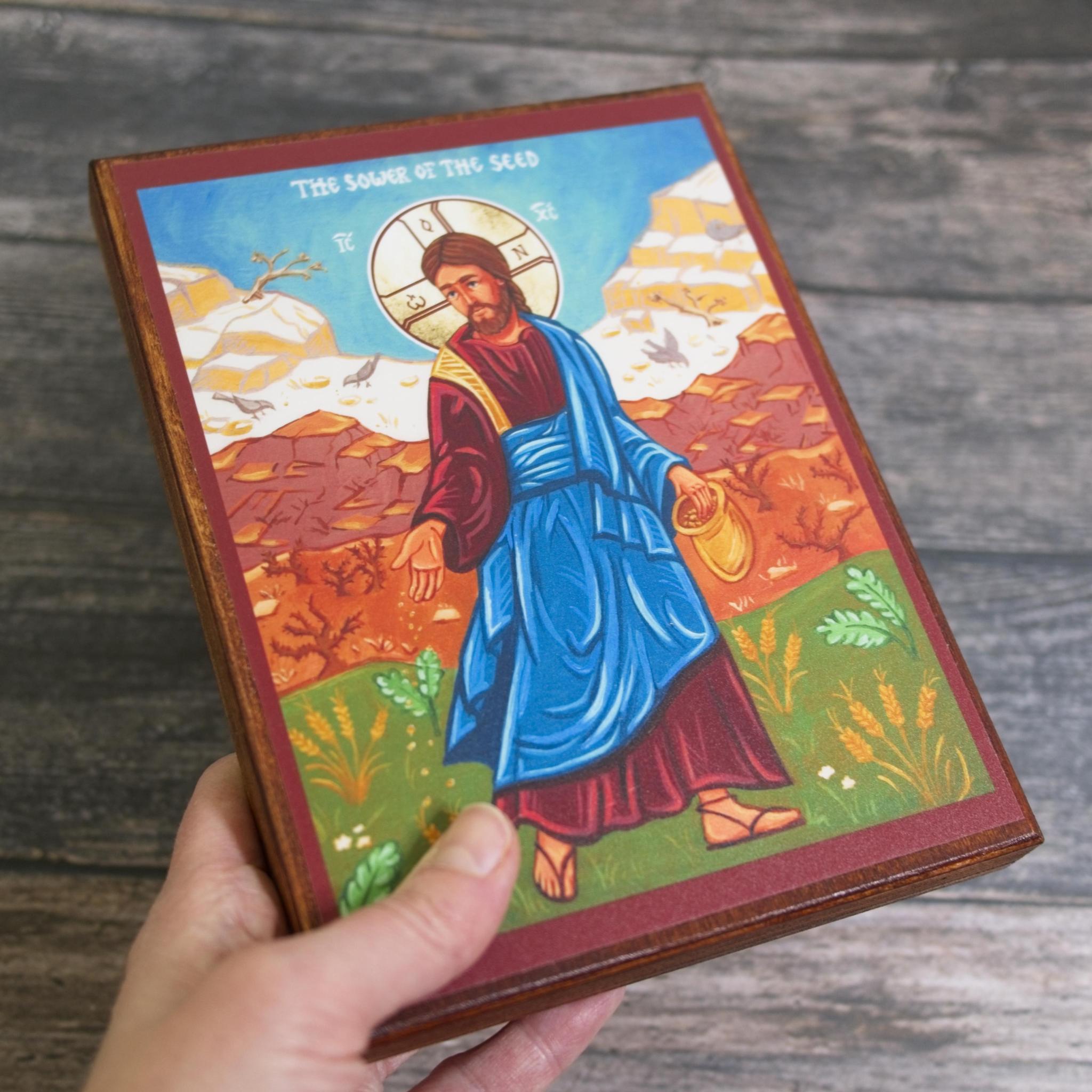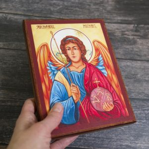 These icon prints are full color, laminated, and mounted on a wooden board. The lamination surface can be done in either glossy (which has a nice bright shine to it), or matte (for a less reflective surface).